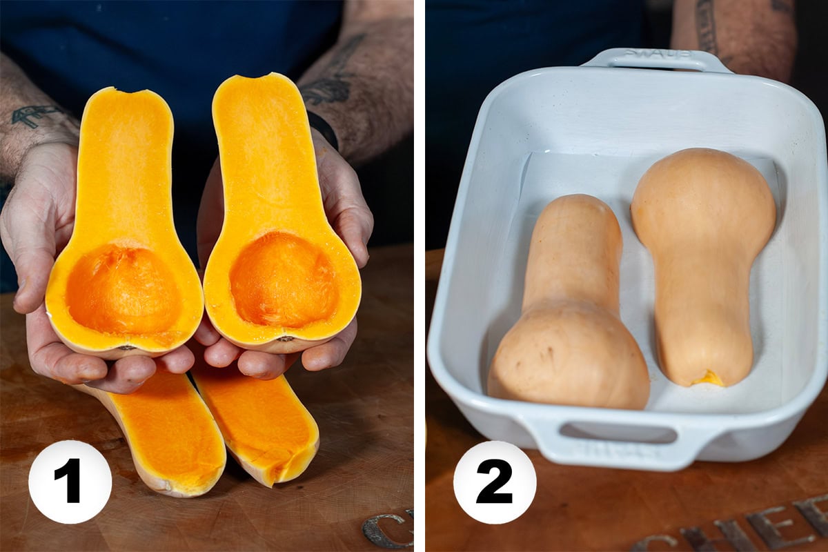 - Preheat oven to 375°F. Slice the butternut squash in half long ways and clean out the seed cavity with a spoon. Spray the inside with avocado oil (or oil of your choice).