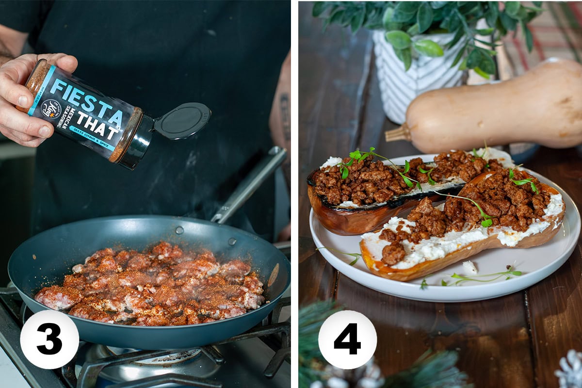 - When the squash is almost done, heat up a skillet on medium heat. Cook ground meat for 3 minutes and then season with taco seasoning. Cook until brown and fully cooked through. Strain access grease if needed.