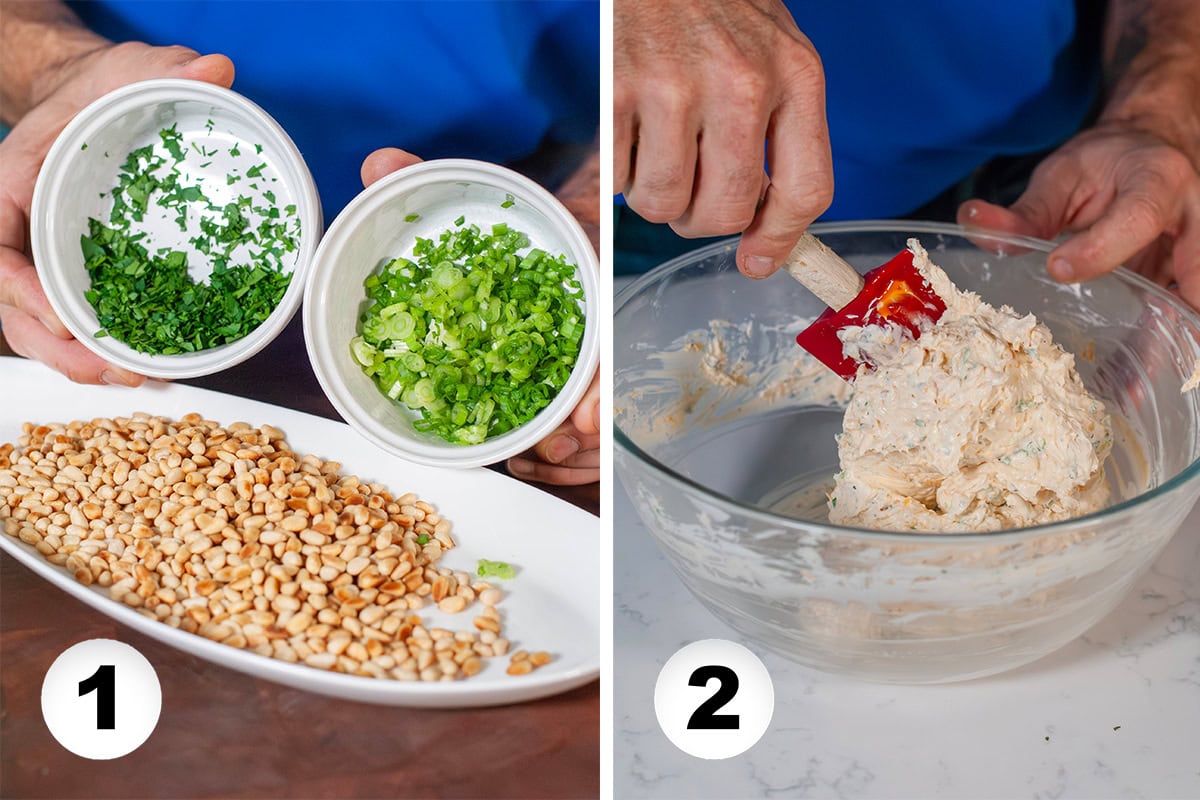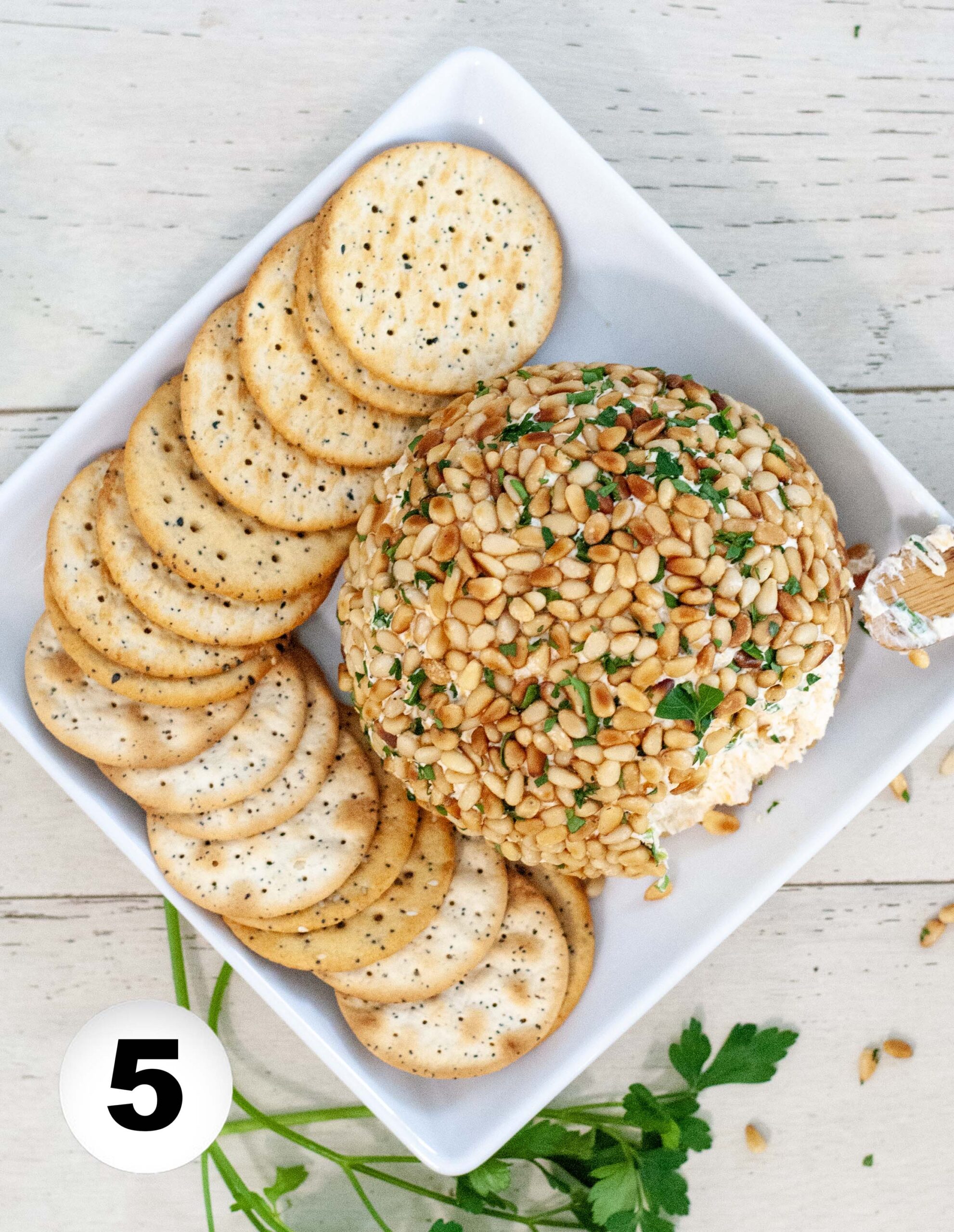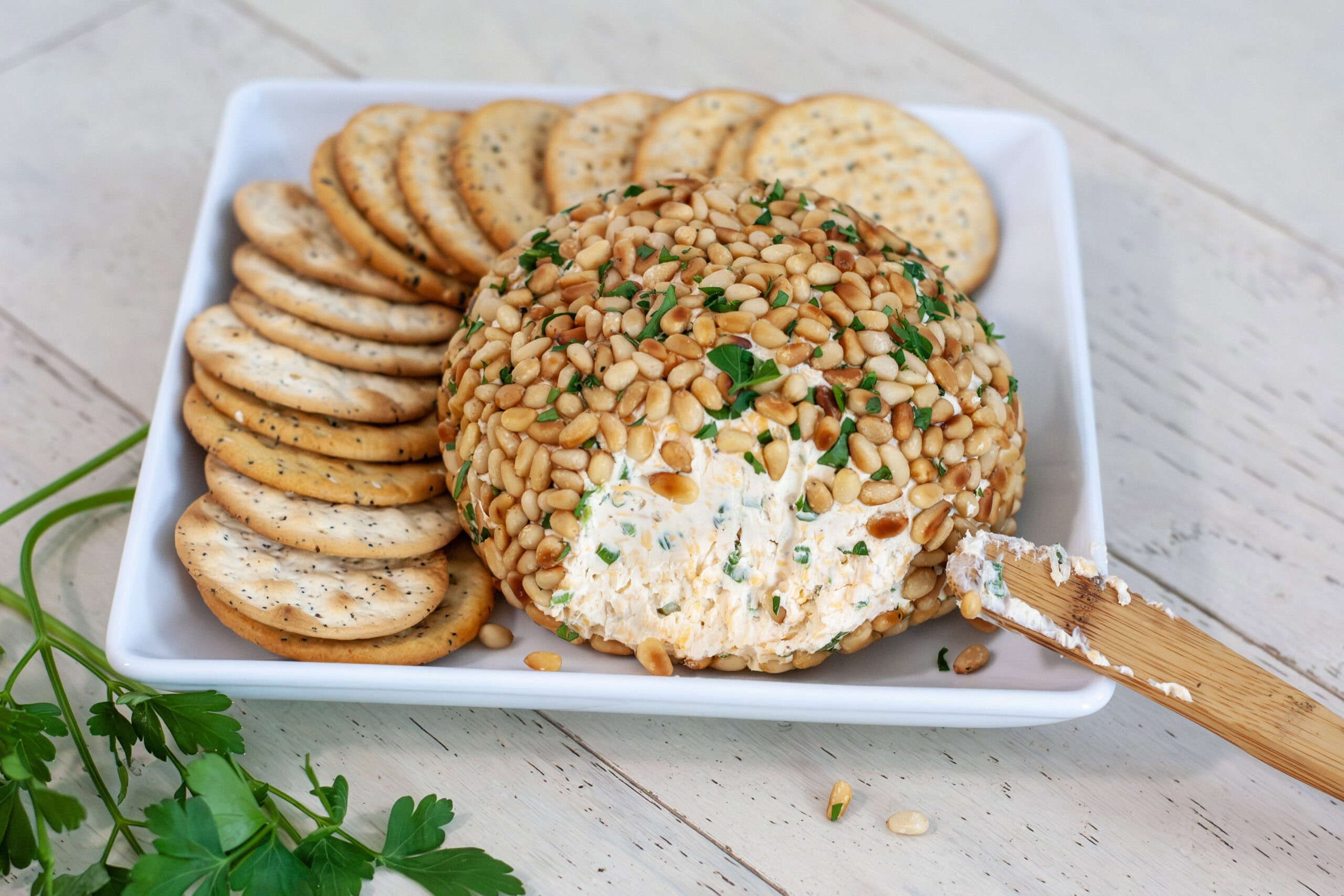 - Place the pine nuts on a large plate or on a sheet of plastic wrap. Sprinkle remaining parsley over the pine nuts. Lightly roll the cheese ball on the pine nuts to get the coating started. Use a clean hand to scoop and press the pine nuts into the bare spots on the cheese ball.