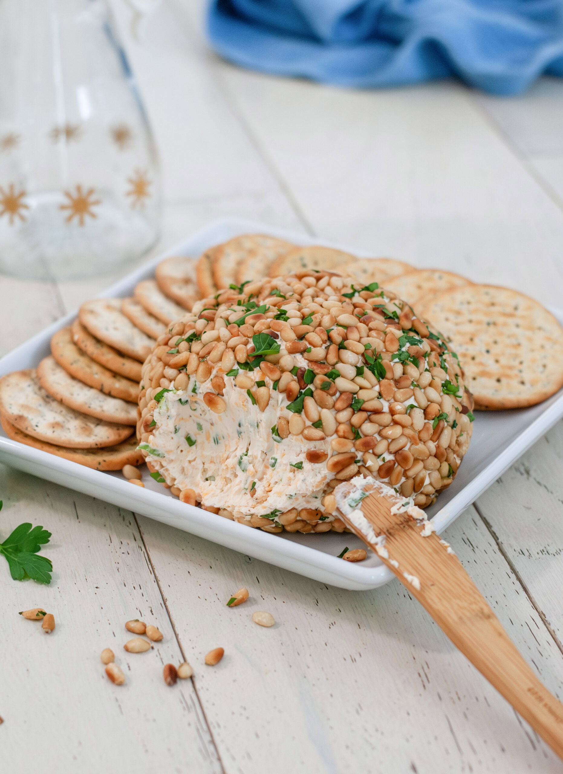 - With Crackers: This is the most traditional way to serve a cheese ball. You can try a mix of buttery crackers, wheat crackers, or pita chips. This gives your guest options.